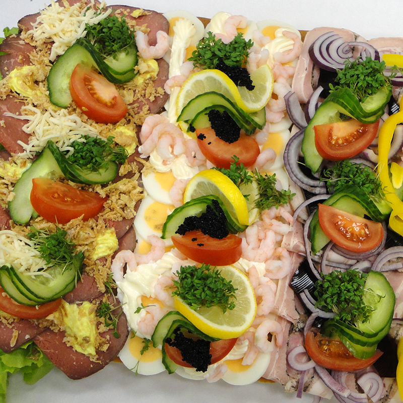 Lækker og flot pyntet pålægs4-kant lavet med 4 slags pålæg. Vælg mellem lyst eller groftbrød